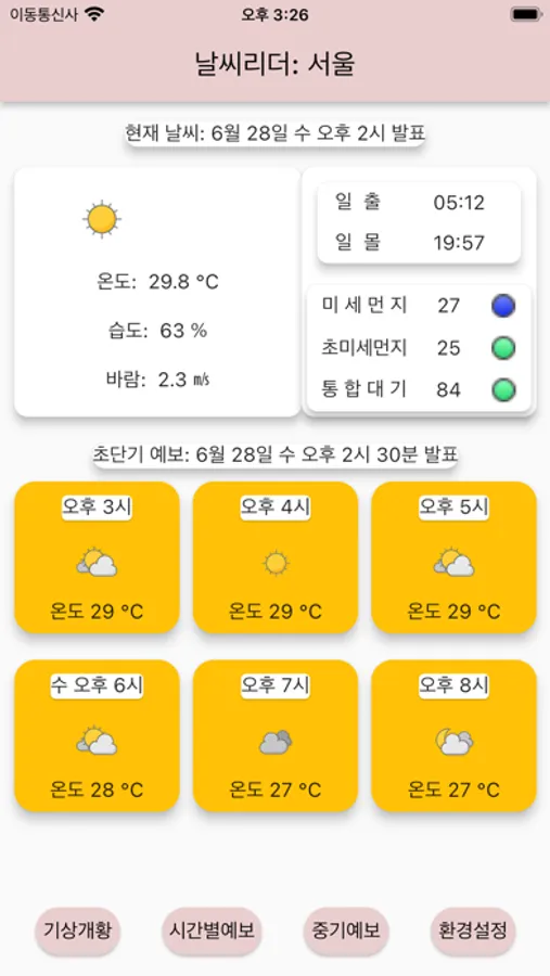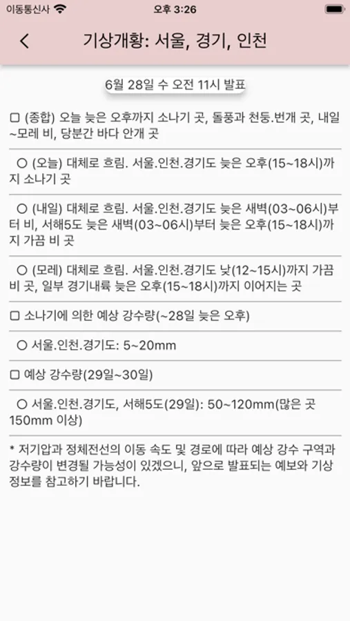 날씨리더에서는 현재날씨, 6시간 이내 날씨만 보여주는 초단기 예보, 광역단위의 대략적인 개황을 알려 주는 기상개황,