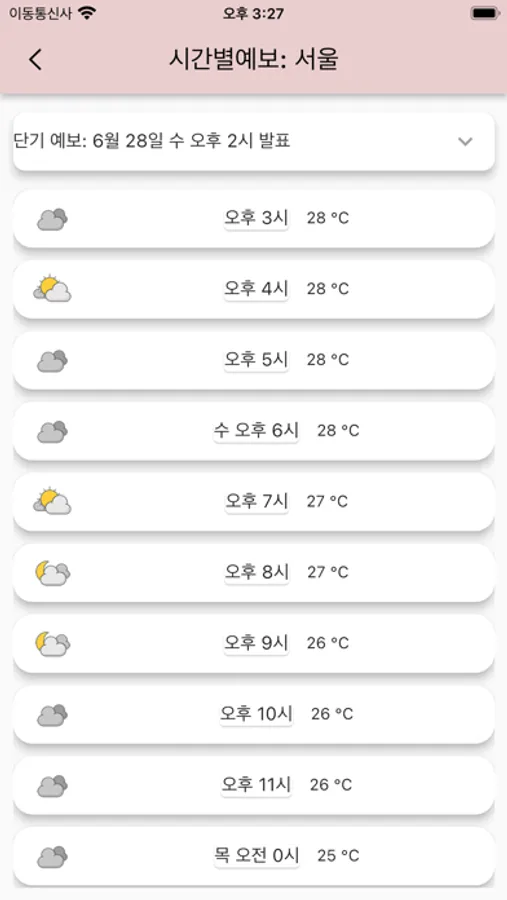 오늘, 내일, 모레 또는 글피까지 시간별로 날씨를 알려 주는 시간별 예보,