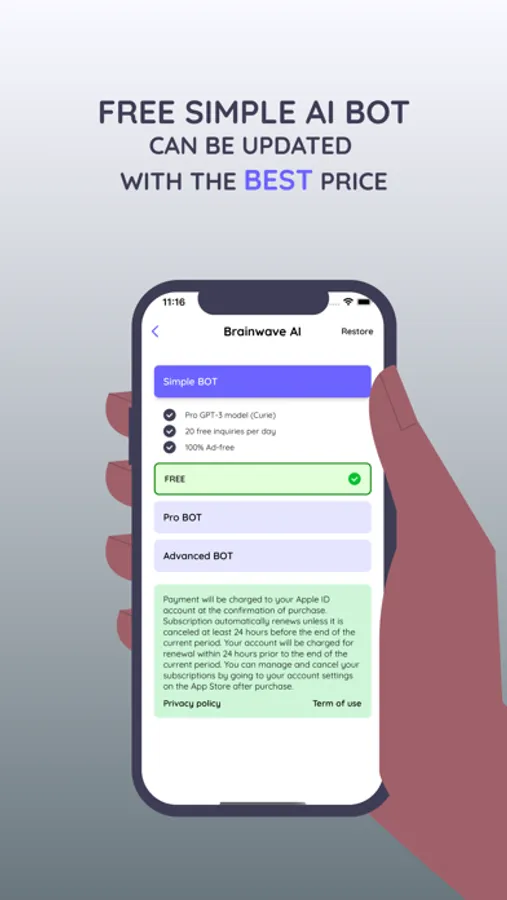 Brainwave AI! Say goodbye to frustrating searches for information and waiting on hold for customer service. With our chat bot AI, you can get real-time assistance and information at your fingertips. Using cutting-edge natural language processing and machine learning, the chat bot AI can understand and respond to a wide range of queries, providing quick and accurate answers to your questions. The intuitive interface makes it easy for anyone to engage in a conversation with the chat bot AI, making it a valuable tool for both personal and professional use. Whether you're looking for help with a product or service, or just want to chat with an intelligent virtual assistant, the Chat Bot AI has got you covered. So why wait? Download the Chat Bot AI now and experience the power of AI technology for yourself!