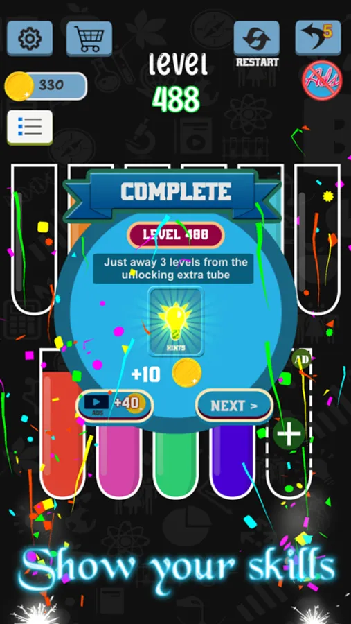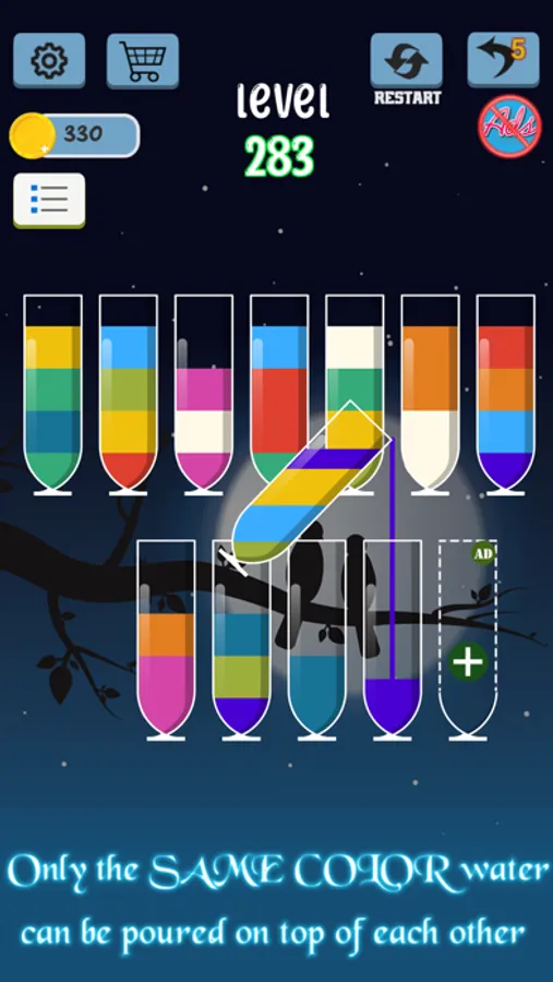 - Progress even faster with power-ups: Rollback, Restart, and adding tubes to pour color liquids into