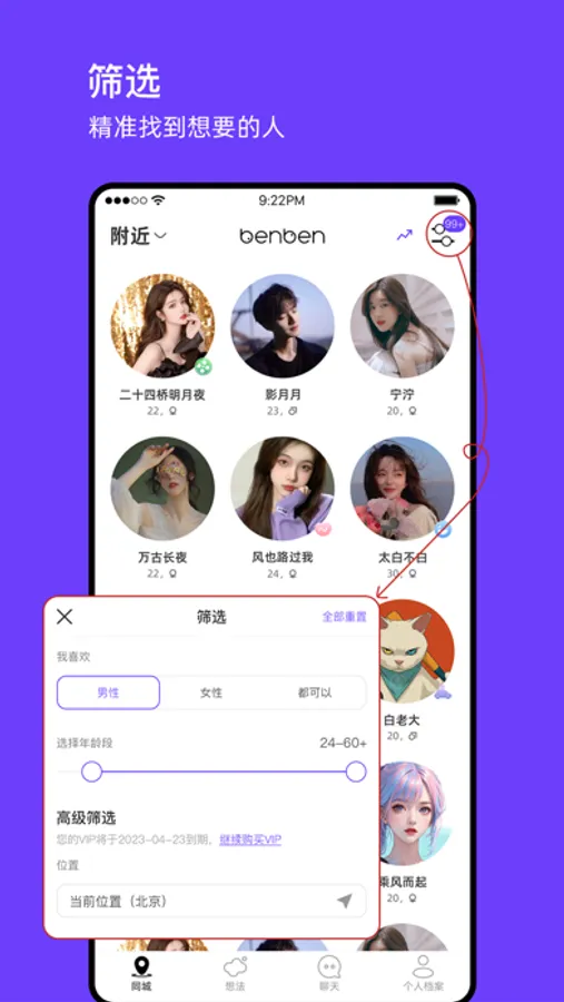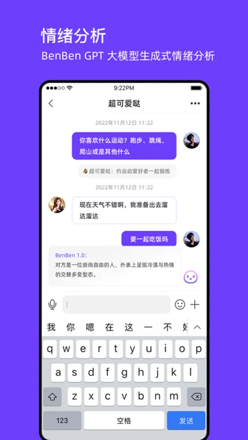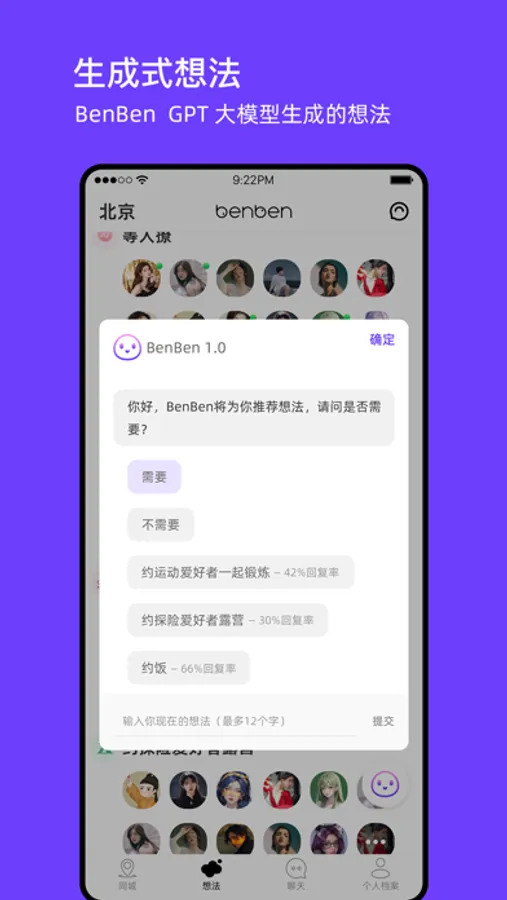 BenBen是集聊天、约会和建立长期关系于一体的智能社交平台。通过想法互动、筛选定制、自我展示等多种方式,用新颖、轻松、个性的交互体验满足真实需要,发展-深化-浇固人与人之间的友谊,目标是为小伙伴们带来“断层级”的用户体验。