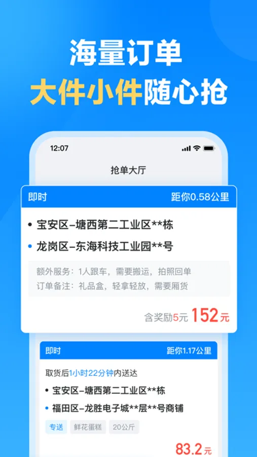 2、特惠送/专送/大件拉货,对比同类型送货平台有更多订单选择,司机可拼单,支持同跨城送货,减少返程空驶
