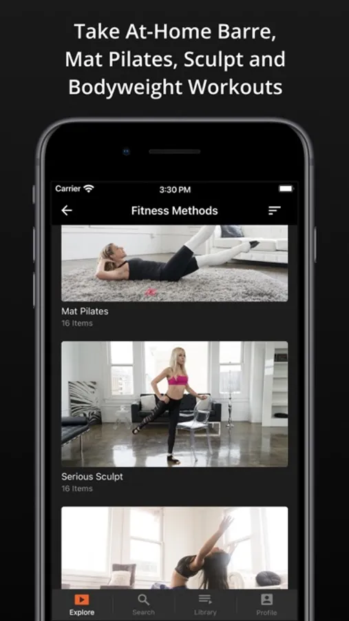 Choose the fitness method you want - Barre, Mat Pilates, Bodyweight exercises, Sculpt, Stretch / Warmup - OR choose the muscle group you want to focus on: arms, booty, legs, core.