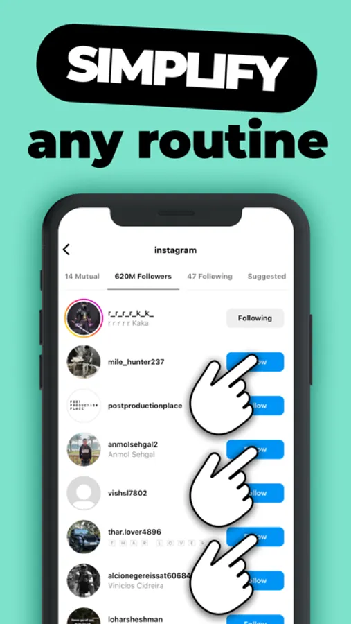 With Auto Clicker, you can easily automate repetitive tasks like autofollowing on Instagram, making better results in games such as Minecraft and Roblox, liking profiles on Tinder, and so much more.