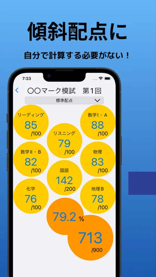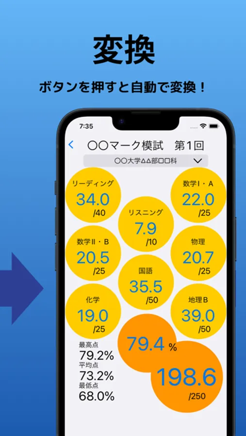 このアプリは過去問、模試、予想問題など様々なテスト成績を管理して、必要な時にいつでも傾斜配点(圧縮配点)に変換してくれるアプリです。