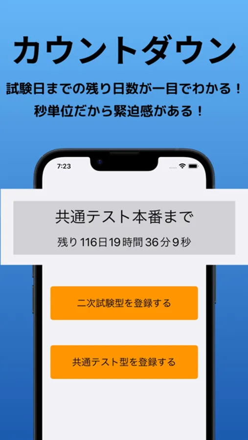 試験日等の大切なイベントまでの日数を秒単位でカウントダウンする機能がついています。