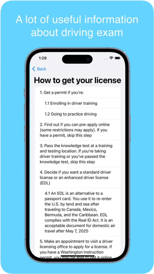 3. List of frequently asked questions and answers that will help you better understand the exam requirements and the rules of the road in the state of Washington.
