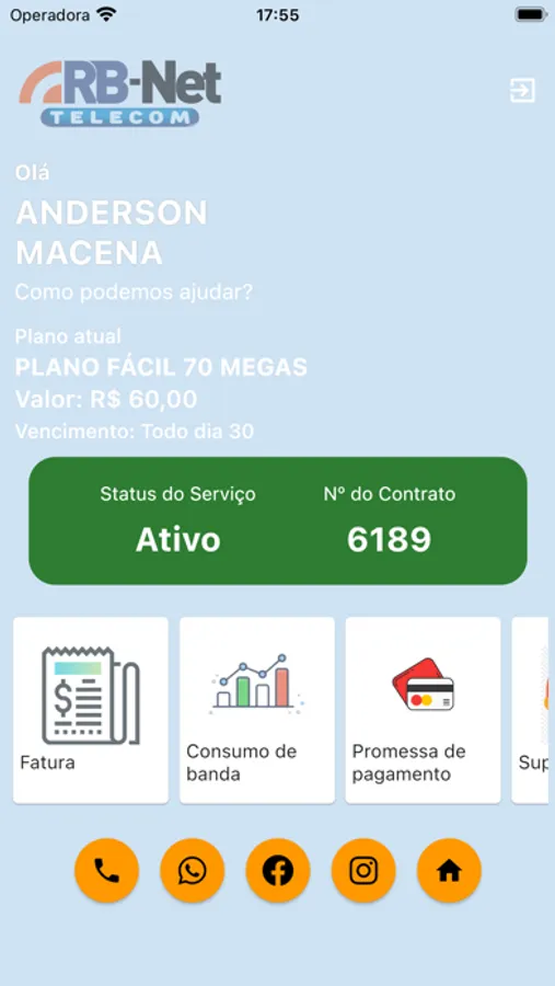 No app da Central do Assinante RB-NET TELECOM você pode: