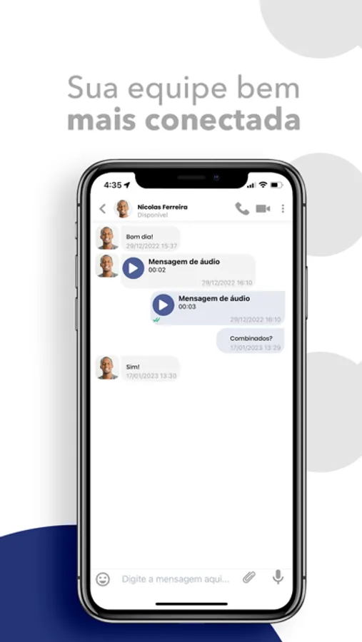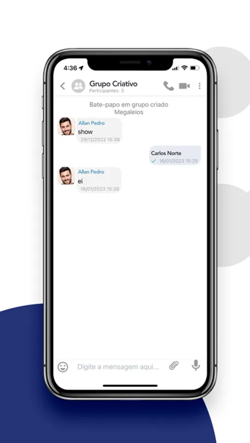 Trocar mensagens em tempo real através de chats individuais. Além do suporte de texto, também é possível enviar arquivos de imagem, áudios e vídeos.