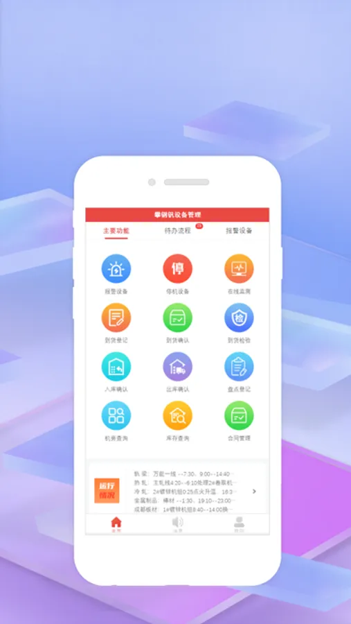 为攀钢钒装备部领导、各仓储人员、点检员等提供移动审核和移动提醒等移动APP应用服务。