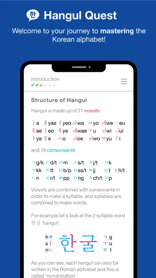 Are you in search of a fun Korean language learning app that covers Hangul alphabet with Korean letters, Korean writing and Korean characters? Well, Hangul Quest is the perfect choice.