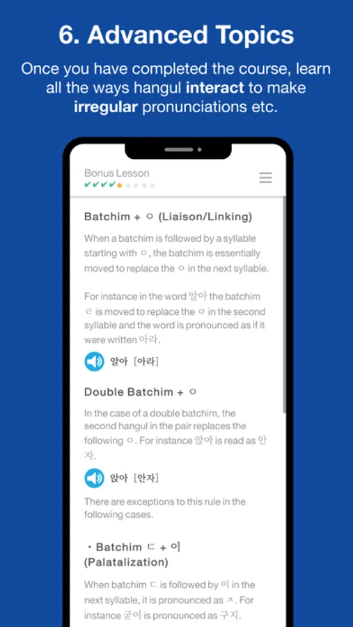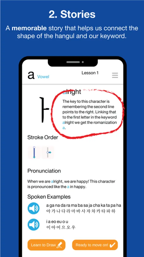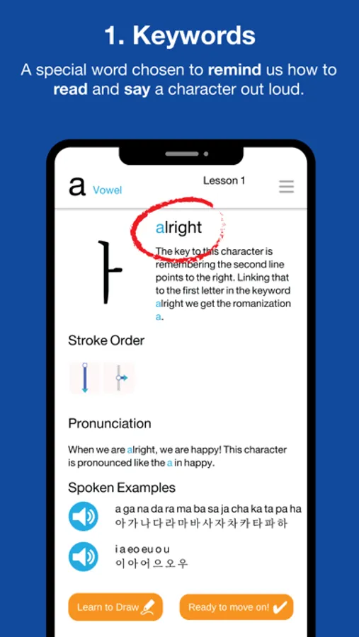 Learn the first 6 Hangul letters for free! If you're impressed, then unlock the rest of the course with a small In App Purchase.