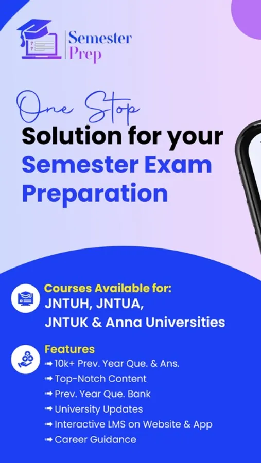 SemesterPrep is a One Stop Solution for all the Students in order to Score a High Percentage/CGPA in the University Semester Exams. We offer Content Curated by Academic Experts which has detailed Explanation of Answers to the University Semester Exam PYQs. We also Provide University Semester Exam PYQ Papers, Objective Type Q&A’s and many more. Apart From these, we also Provide Regular Updates on University Exams, Syllabus, Time Tables etc. We also Provide Guidance for Various Career Options in India and Abroad by giving Regular Updates. This Content Can be Accessed through Browser & App.