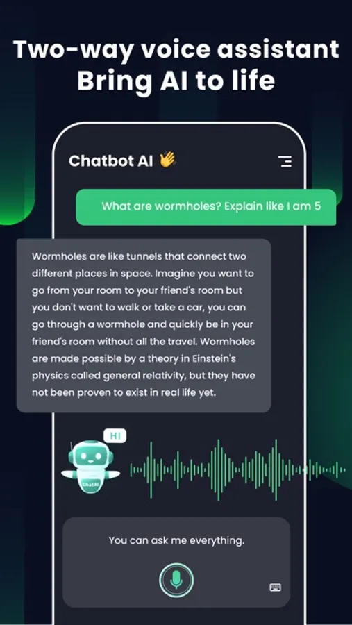ChatBot for AI Chat is a breakthrough AI-based smart chat application that allows you to ask questions and chat with an amazing assistant using AI technology.