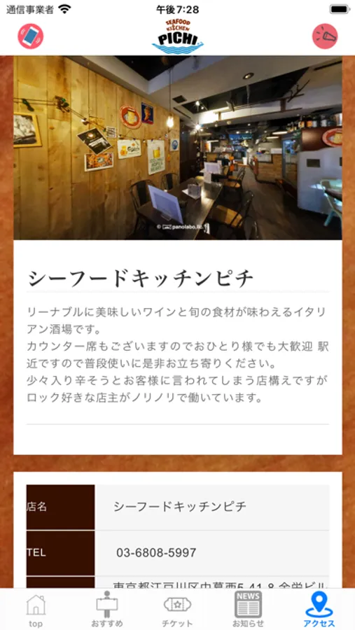 PICHIアプリは、東京都江戸川区中葛西5丁目にあるイタリアン・ワインバル「PICHI」の公式アプリです。
