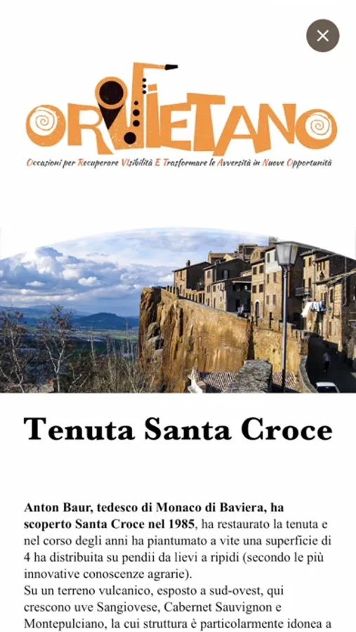 Ecco "O.R.VI.ET.A.N.O" (Occasioni per recuperare visibilità e trasformare le avversità in nuove opportunità), un partenariato pubblico-privato, composto dal Comune di Orvieto, 8 aziende agricole del territorio, 6 imprese artigiane e turistiche e 5 partners tra associazioni culturali e sportive ed enti di formazione.