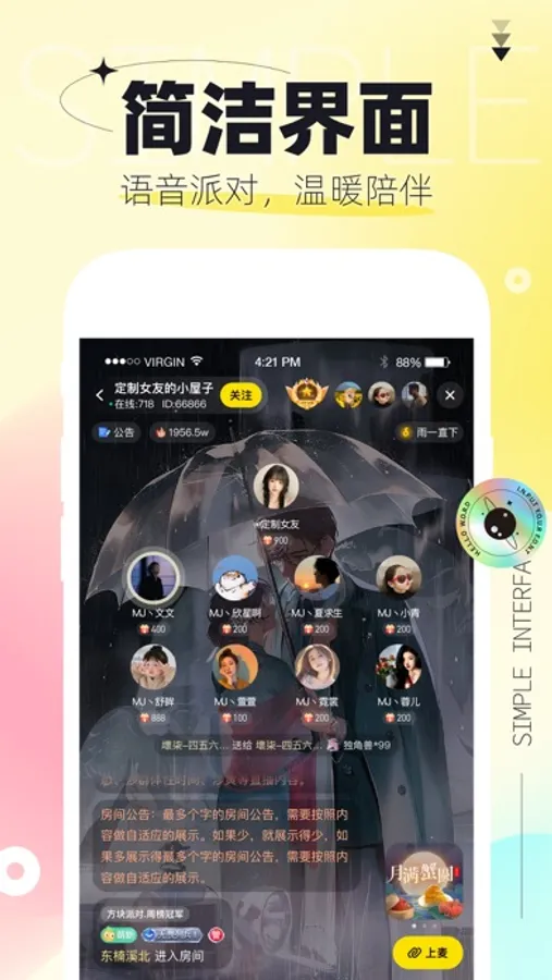 聊天轰趴,有趣的灵魂等你来撩,更有经典交友、心动、pk等模式,各种欢乐不停歇,让你的派对新鲜有趣!想交个朋友更是so easy,就等你来!还可以和你喜欢的玩伴达成守护密友关系哦,拉近彼此亲密距离!