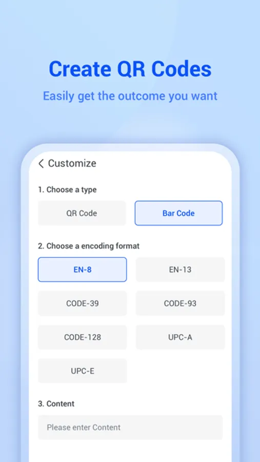 You can choose various encodings including Data Matrix, Code 39, Code 93, EAN-8, and UPC-E, and customize the color and text of your QR Code.