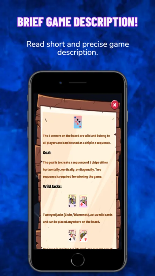 The player chooses a card from their hand, and places a chip on one of the corresponding spaces of the game board (Example: they choose Ace of Diamonds from their hand and place a chip on the Ace of Diamonds on the board). Jacks have special powers. Two-Eyed Jacks can represent any card and may be used to place a chip on any open space on the board. One-Eyed Jacks can remove an opponent's token from a space. Players may use the Two-Eyed Jacks to complete a row or block an opponent, and One-Eyed Jacks can remove an opponent's advantage. One-Eyed Jacks cannot be used to remove a marker chip that is already part of a completed sequence; once a sequence is achieved by a player or team, it stands.