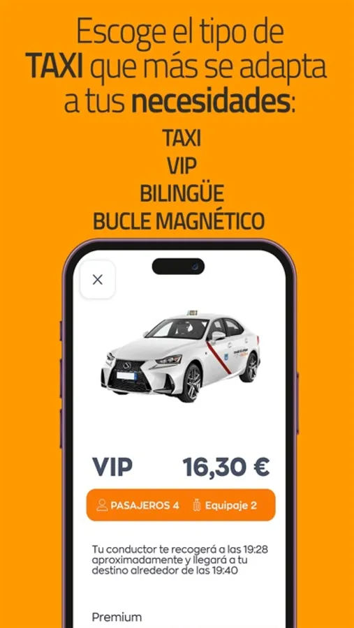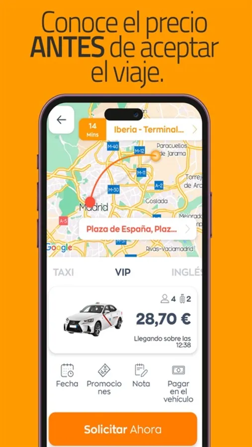 Pida un taxi para ahora o realice una reserva. Páguelo en efectivo o con tarjeta de crédito en el propio servicio.