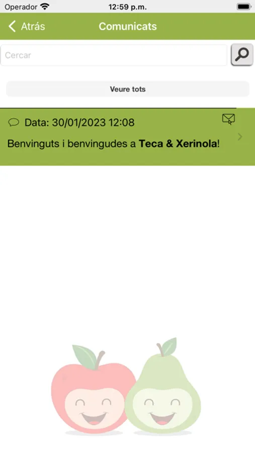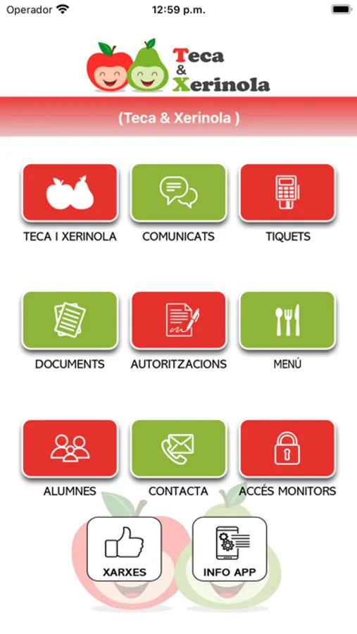 App de Teca & Xerinola, càtering en centres d'ensenyament i proveïdors d'activitats extraescolars. L'aplicació permet una comunicació directa entre Teca & Xerinola i els usuaris. El menú consta amb diverses opcions: qui som, comunicats, tiquets, documents, autoritzacions, menú menjador, alumnes, contacta i accés monitors. A la barra inferior hi ha les seccions: xarxes i Info App.