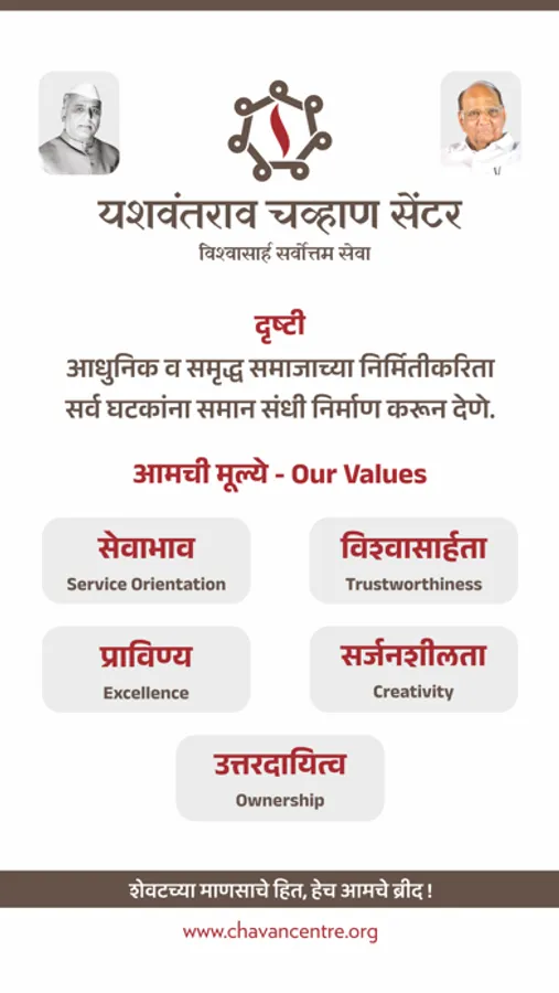 यशवंतराव चव्हाण साहेबांच्या पश्चात त्यांच्या कृतीशील विचारांचा वारसा आदरणीय शरदचंद्रजी पवार साहेब आणि सहकारी, चव्हाण सेंटरच्या माध्यमातून जोपासत आहेत. आधुनिक आणि समृद्ध समाजाच्या निर्मितीकरता सर्व घटकांना समान संधी निर्माण करून देणे ही दृष्टी डोळ्यासमोर ठेऊन युवा, शिक्षण, महिला, आरोग्य, दिव्यांग व ज्येष्ठ नागरिक आणि सांस्कृतिक क्षेत्रांमध्ये यशवंतराव चव्हाण सेंटर महत्त्वपूर्ण भूमिका पार पाडत आहे.