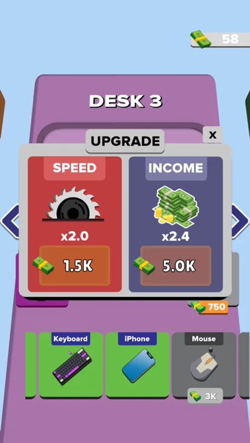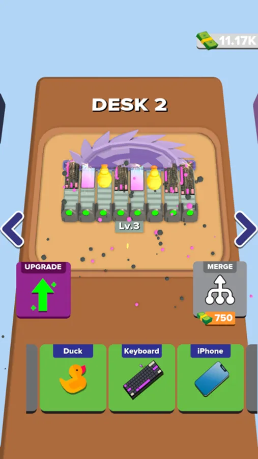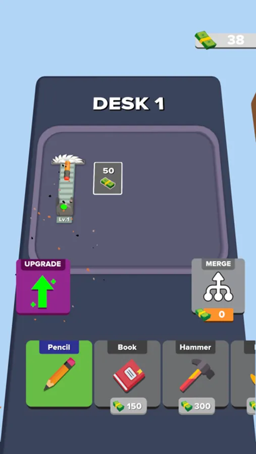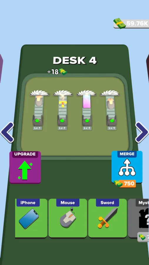 Up to four grinders fit on one desk. What will you do if you want to grind more items? Of course you will move to other desks. This game is so crazy that there are a lot of desks and you can buy grinders and upgrade them. You can level up by merging the grinders, or you can speed up your saws or get income with an upgrade.