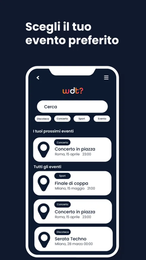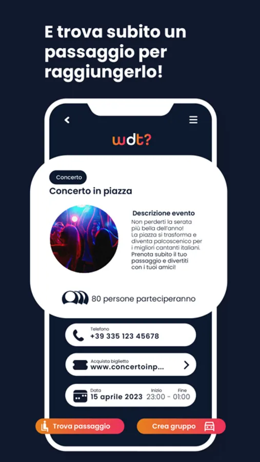 Tramite WDT è possibile trovare utenti con passioni in comune con cui condividere il viaggio in auto per raggiungere i propri eventi in programma, condividendo le spese ed incontrando nuovi amici.