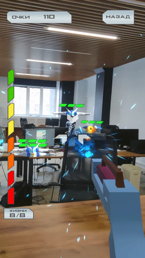 Атака Дронов - игра в дополненной реальности, в которой вам предстоит уничтожать дронов, целясь в них с помощью телефона, и уворачиваясь от выстрелов.