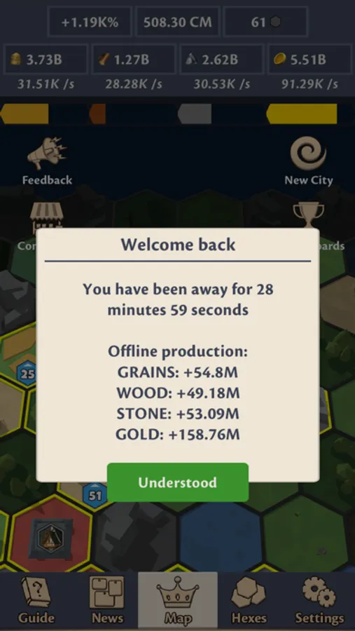 Idle Hex Realms is an incremental idle game (where you progress even when you are AFK), uniting multiple genres (idle, boardgames, city building, CCG).