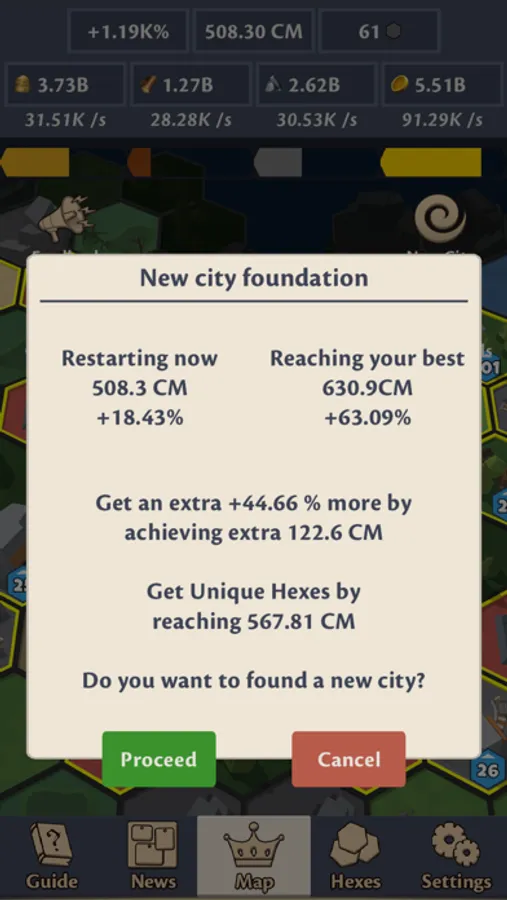 Every new city starts with a new randomly generated map and a random draw of three starting Unique Hexes from your gathered collection to help you grow your new city in various ways.