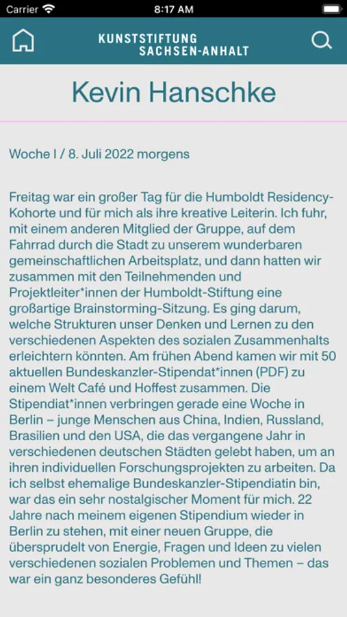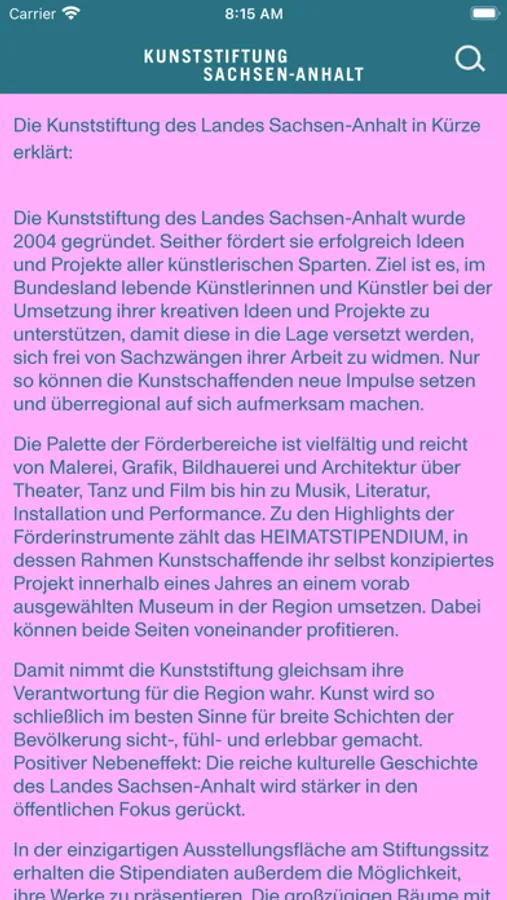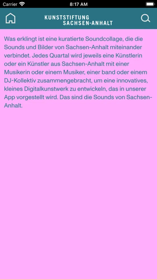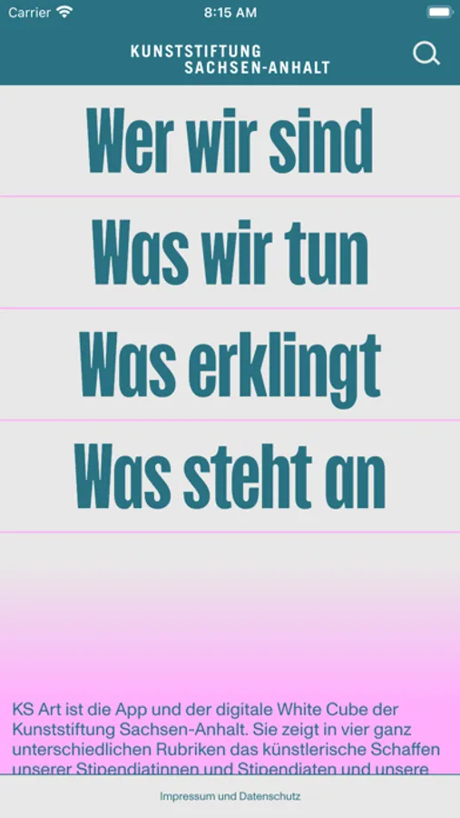 KS Art ist die App und der digitale White Cube der Kunststiftung Sachsen-Anhalt. Sie zeigt in vier ganz unterschiedlichen Rubriken das künstlerische Schaffen unserer Stipendiatinnen und Stipendiaten und unsere nationale und internationale Arbeit. In vier Rubriken wird darin der Kosmos der Kunststiftung mit Sitz in Halle an der Saale vorgestellt. In der ersten Kategorie „Wer wir sind“ werden unsere Stipendiatinnen und Stipendiaten und ihre Werke präsentiert. In der Kategorie „Was wir tun“ übernimmt eine Stipendiatin oder ein Stipendiat für einen Monat lang die App und stellt das persönliche Atelier, den Alltag, eine besondere Reise oder einen Residenzaufenthalt vor. Kategorie drei „Was erklingt“ ist dem Sound gewidmet. In einer Kollaboration von Musikern, DJs und Tonkünstler*innen, gemeinsam mit Designer*innen, Grafiker*innen und Künstler*innen entstehen kleine Videokunstwerke, die in dieser digitalen Galerie ausgestellt werden. In der letzten Kategorie „Was steht an“ sind die Termine und Veranstaltungen der Kunststiftung aufgeführt. Sachsen-Anhalt ist ein Land der Moderne und der Romantik, der Kunst und der Wissenschaft, das schlägt sich auch in der Gegenwartskunst wieder, die wir auf vielfältige Weise unterstützen. Wir laden sie herzlich ein, sie mit dieser Applikation zu entdecken.