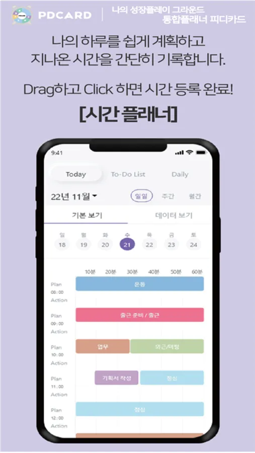 - 간편한 기록 : 10분 단위 Drag&Click으로 시간 기록 → 데이터화