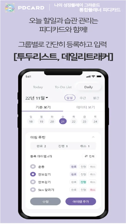 - 일일, 주간, 월간 진행률 확인