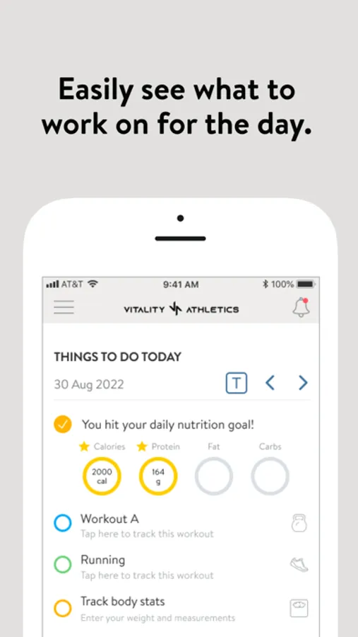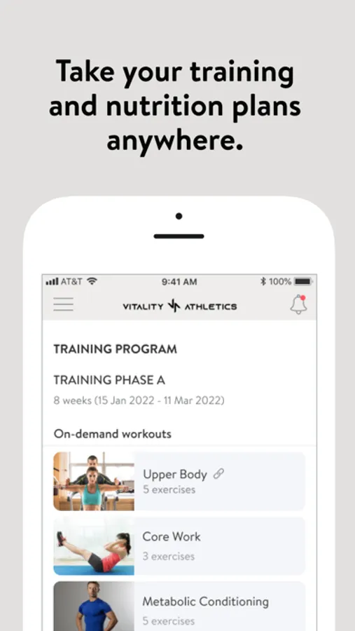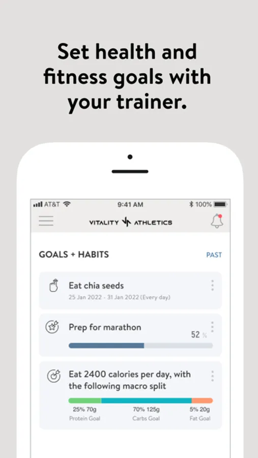 With the Vitality Athletics App, you will have access to workout programs designed specifically to help you reach your fitness and health goals! You can follow & track your workouts, your nutrition, your lifestyle habits, measurements and results–all with the help of your coach.