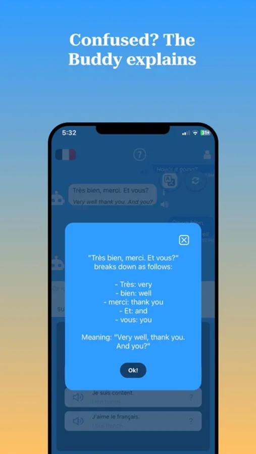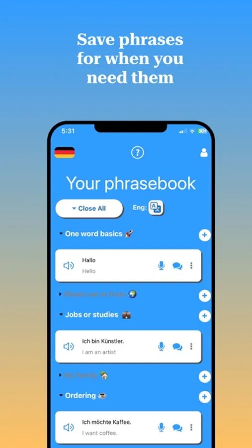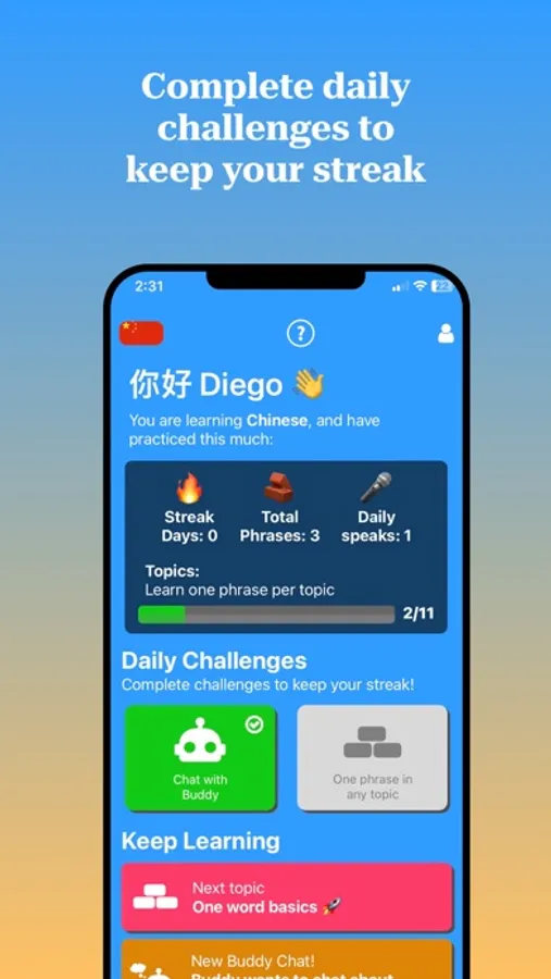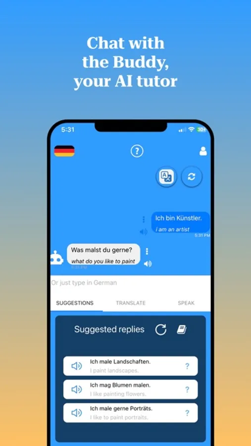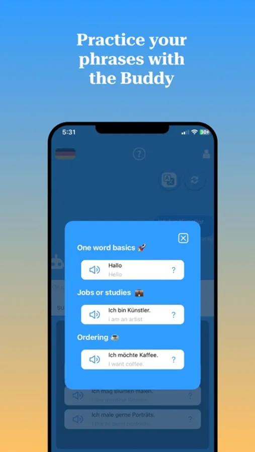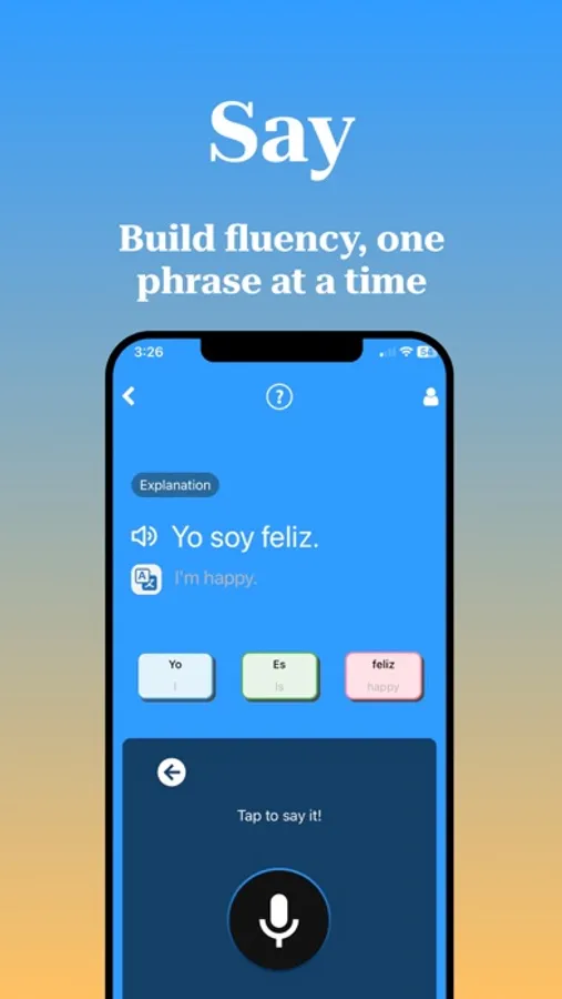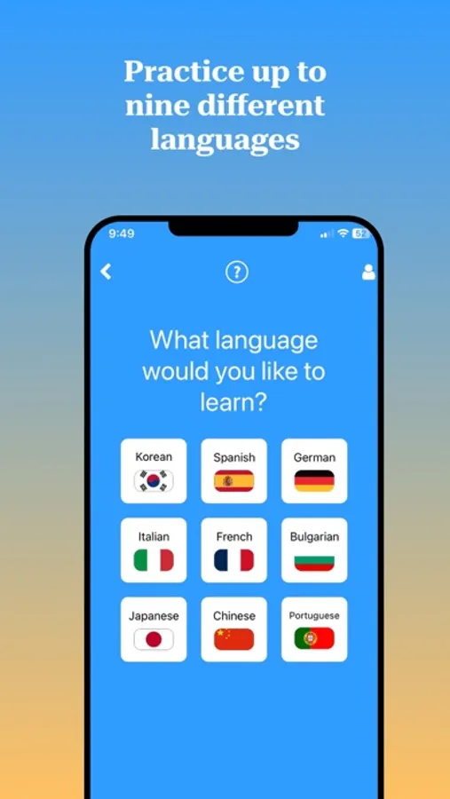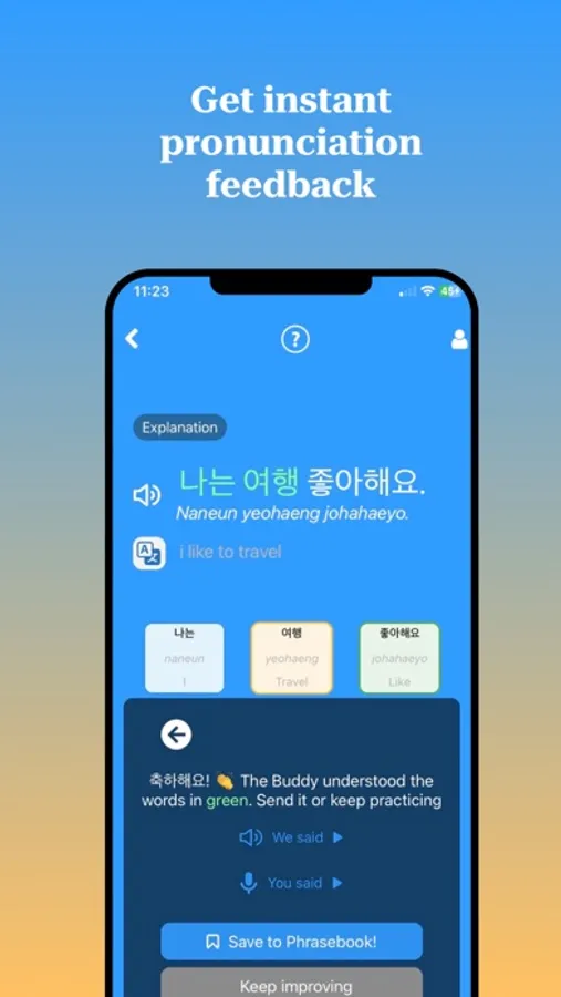Learn a language by speaking with your AI Buddy. Choose words and phrases that matter to you. Practice pronunciation and speak out loud. Build your personal phrasebook for travel and more. Available for Korean, Spanish, German, Italian, French, Bulgarian, Japanese, Chinese, and Portuguese.