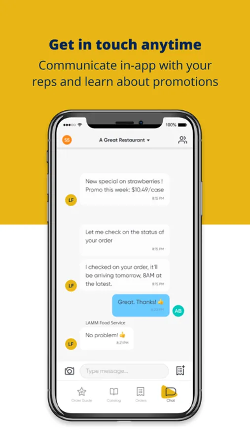 - Get in touch anytime: communicate directly with your LAMM Food Service rep in the app