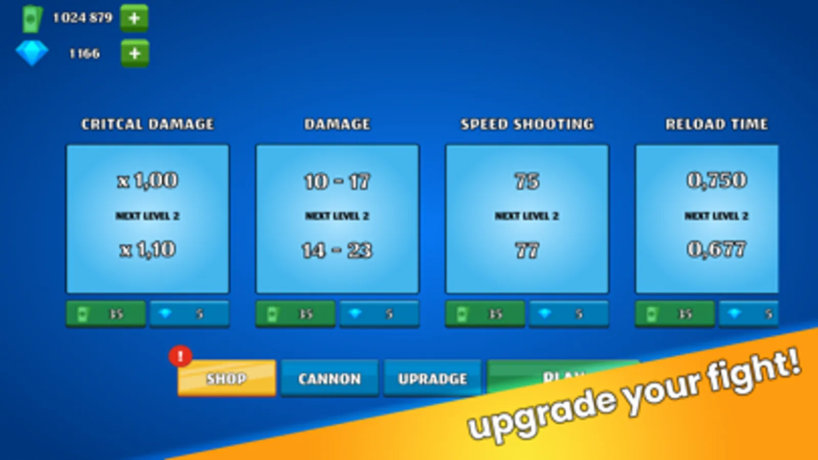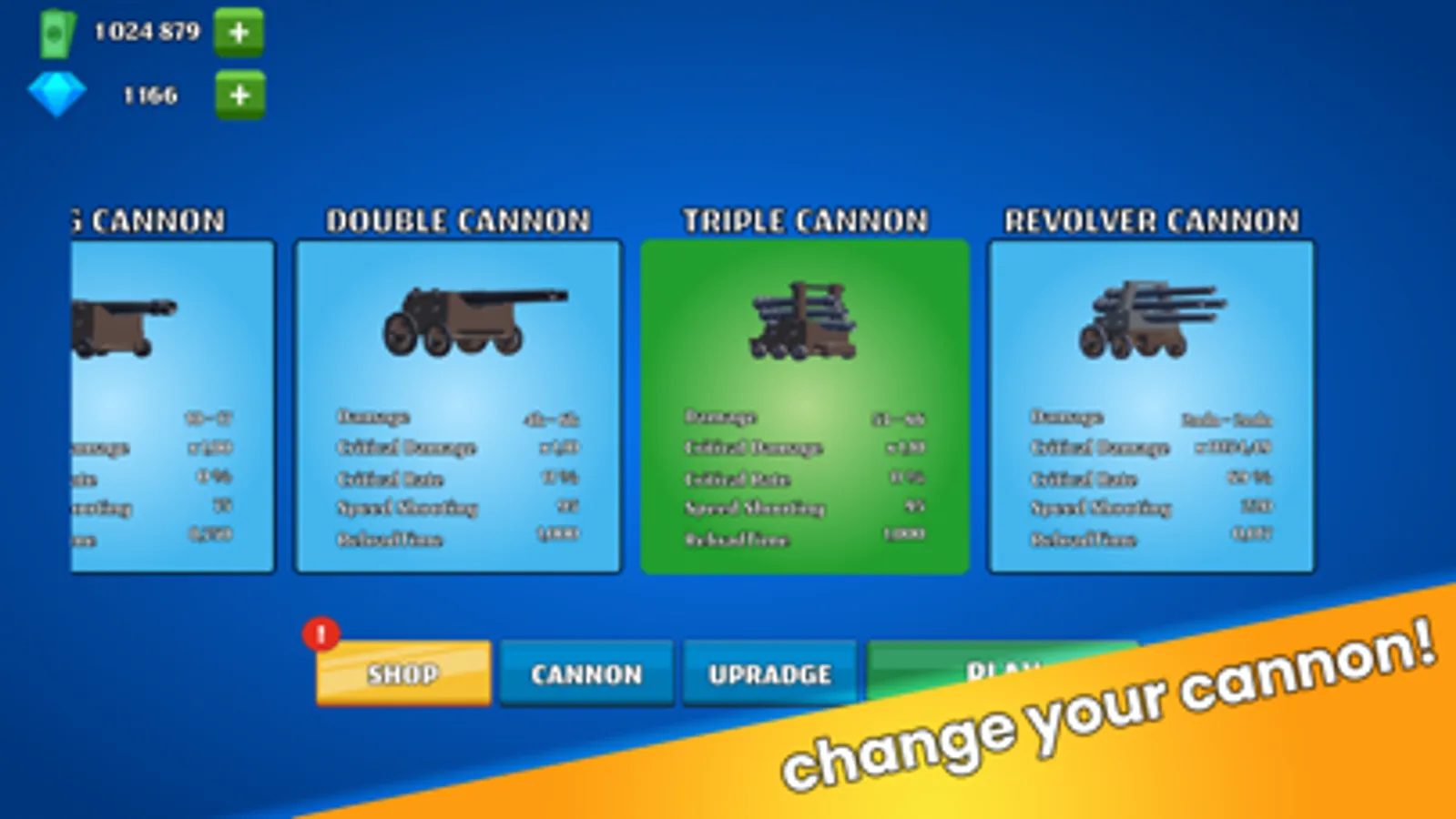 Choose a cannon from several possible ones. Upgrade the stats of the cannon and start the game. Wait for waves of enemies that will try to break through your coast. Defend yourself, collect money and diamonds. Become better and invincible. Discover new weapons and new cannons.
