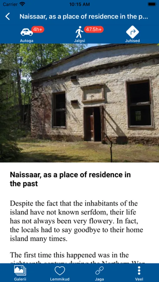 Aegna Island audiguide and tourist map. POI, behind-the scenes stories and directions play automatically, based on your GPS location. An internet connection is required only to download the contents. During the usage no data connection nor internet is required. When you exit the app during the route for any reason, you need to restore internet connection and repeat download using the same password. Follow the tour from your smartphone. For a better experience, it is recommended to bring headphones. If not, the sound will come out of the smartphone's speakers. The tour launches wherever you reach the POI on your route, you can modify your track at your own will.