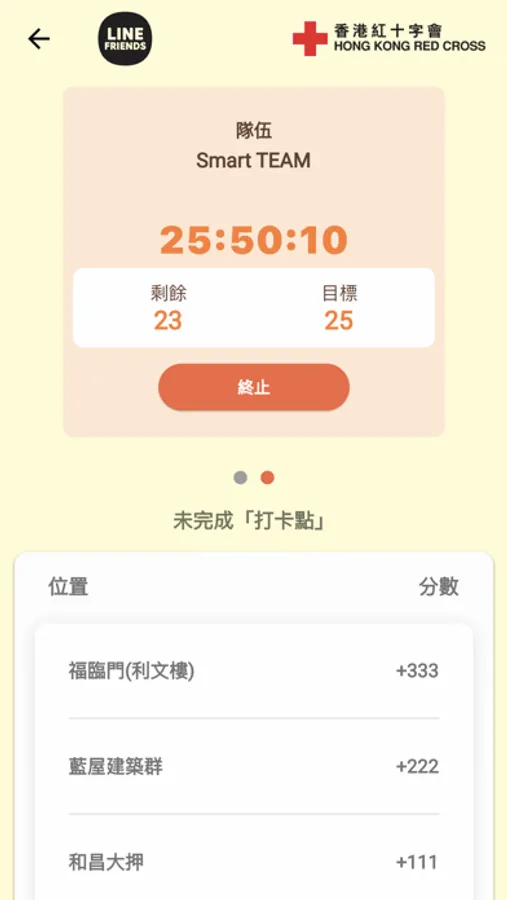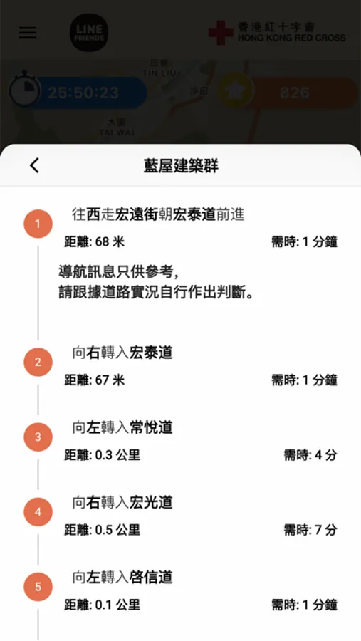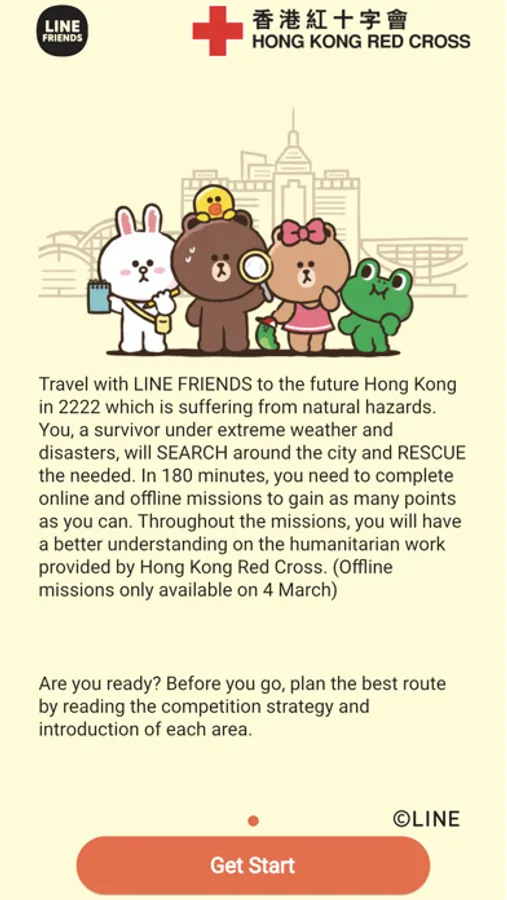 紅十字會緊急救援隊伍與LINE FRIENDS Buddies結伴整裝出發,拯救受困在城市不同角落、受影響的市民!參加者會經歷模擬大型災難區域,並與LINE FRIENDS Buddies一齊完成任務。參加者須在指定時間,於上環至銅鑼灣地區,尋找指定「打卡點」完成「線上挑戰」及加分任務,爭取最多分數。