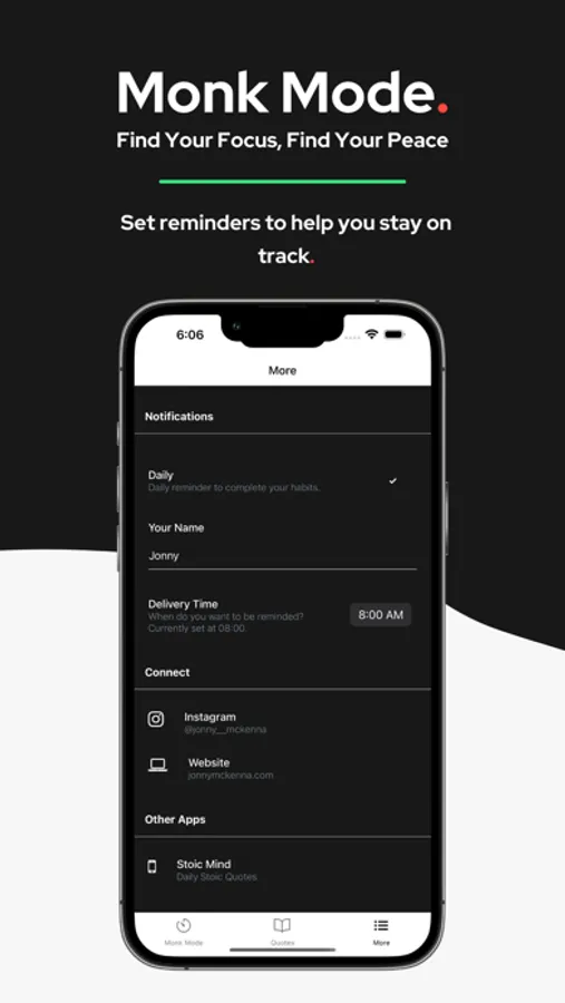 Monk Mode is your ultimate companion for developing daily discipline and motivation. With a collection of powerful quotes and easy-to-use tracking tools, Monk Mode will help you cultivate the habits you need to live a healthier, more productive life. Whether you're looking to adopt a new habit or stick to your current routine, Monk Mode has everything you need to stay on track.