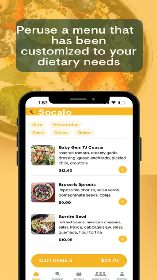 DISCOVER RESTAURANTS--that have dishes based on your exact dietary preferences through the app for pickup or delivery.