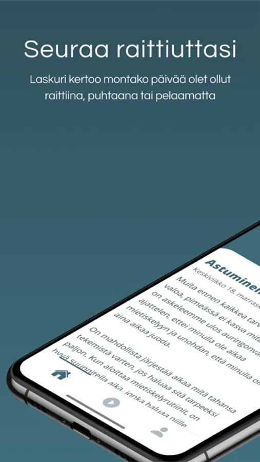 Kantamo-sovelluksen avulla saat tukea päihteettömään elämään. Sovellus tukee eri riippuvuuden muodoissa, oli kyseessä sitten alkoholismi, huumeriippuvuus tai peliriippuvuus. Voit seurata laskurin avulla raittiiden / puhtaiden / pelaamattomien päivien määrää ja saada palkintoja edistymisestäsi.