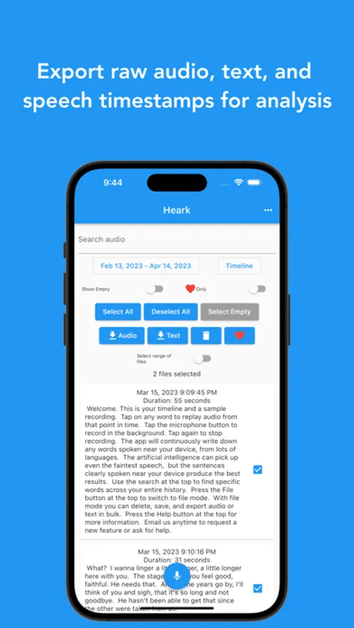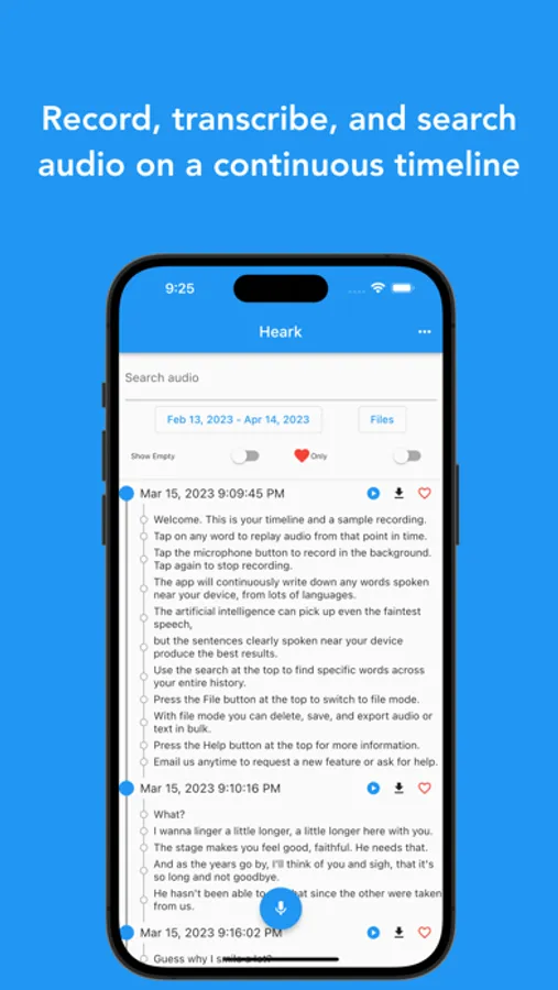 Record and transcribe live audio. Record classes, zoom calls, in-person meetings, events, podcasts, interviews, or a full day. Use Heark like a second long-term memory. Transcribe speech from many languages into text. Search through audio history by keyword and date range. Save unlimited audio to private cloud storage. Download, delete, or send audio files. Read text in timeline mode or browse files in file mode. Select audio files and send as a text document, csv file, or audio files.