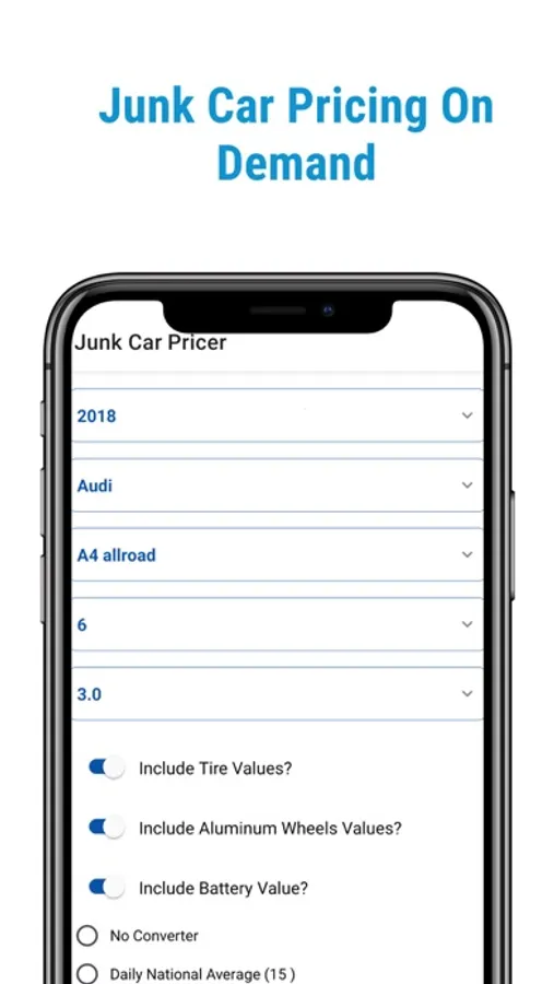 Use fast and easy dropdown selections on your phone to get instant price values for any car. Junk Car Pricer is customizable with your unique User dashboard. Select values for your scrap metal selling price, tires, aluminum wheels, battery and even customize your converter options to quote efficiently and maximize profits.
