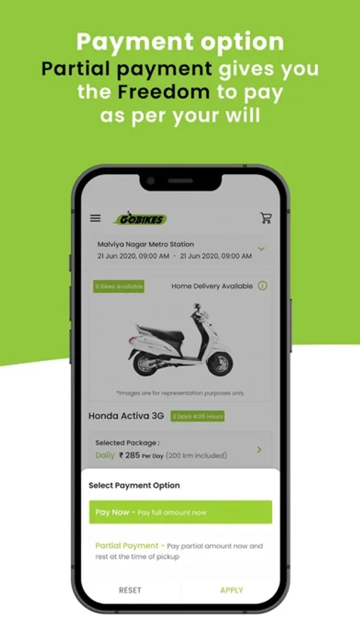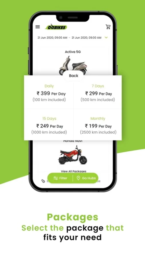 1. Find your Ride:- Enter the basic details like city, pick up and drop date, and time to choose from a list of available two-wheelers at your desired go-hub.