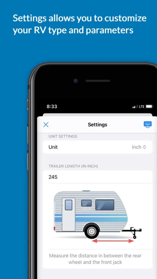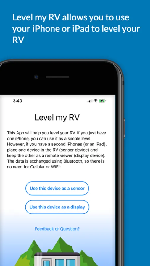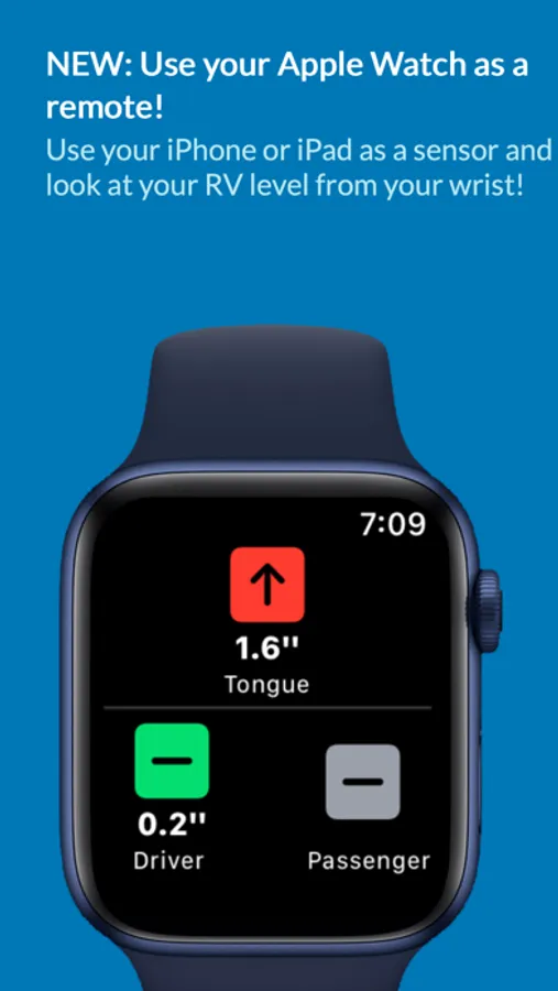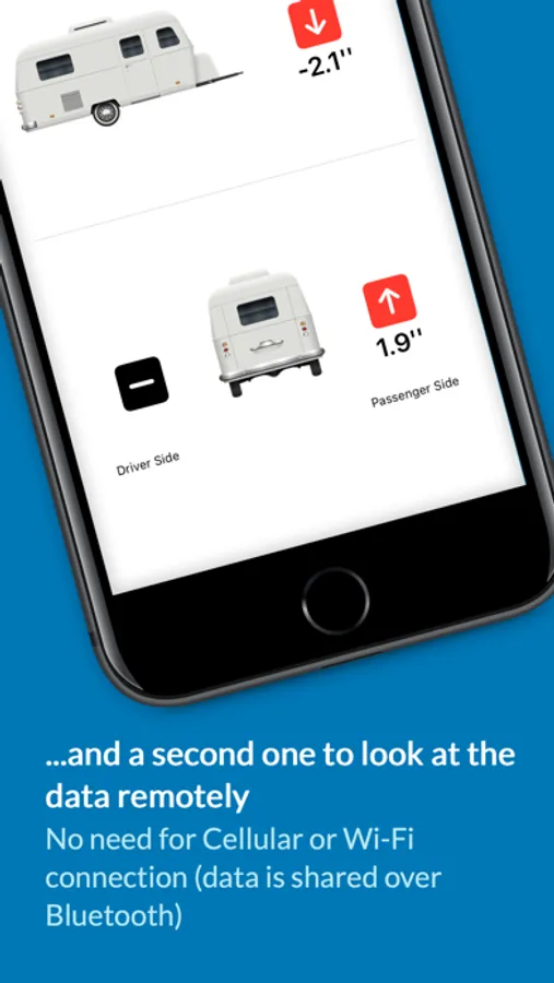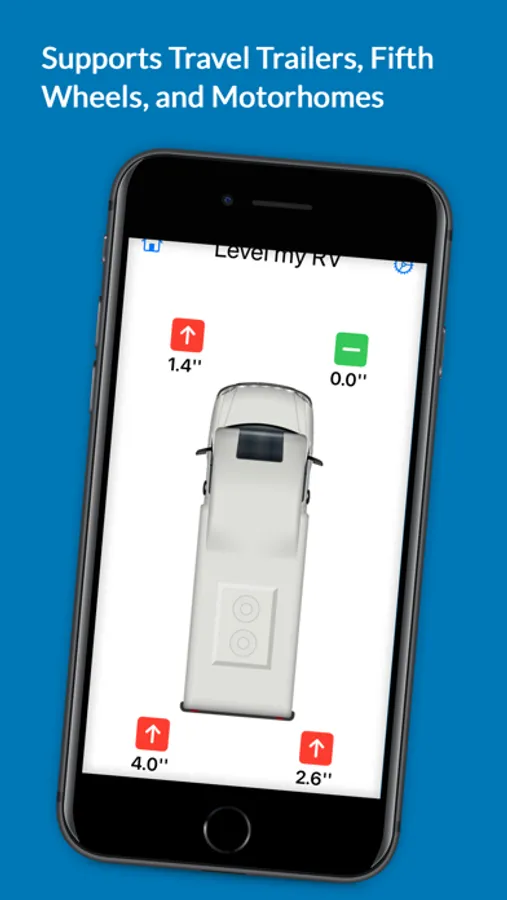 Level my RV will help you level your Travel Trailer, Fifth Wheel, or Motorhome. If you just have one iPhone or iPad, you can use it as a simple level. However, if you have a second device (a second iPhone, or iPad, or even an Apple Watch), place one device in the RV and keep the other as a remote viewer. The data is exchanged using Bluetooth, so there is no need for cellular service or Wi-Fi connectivity!