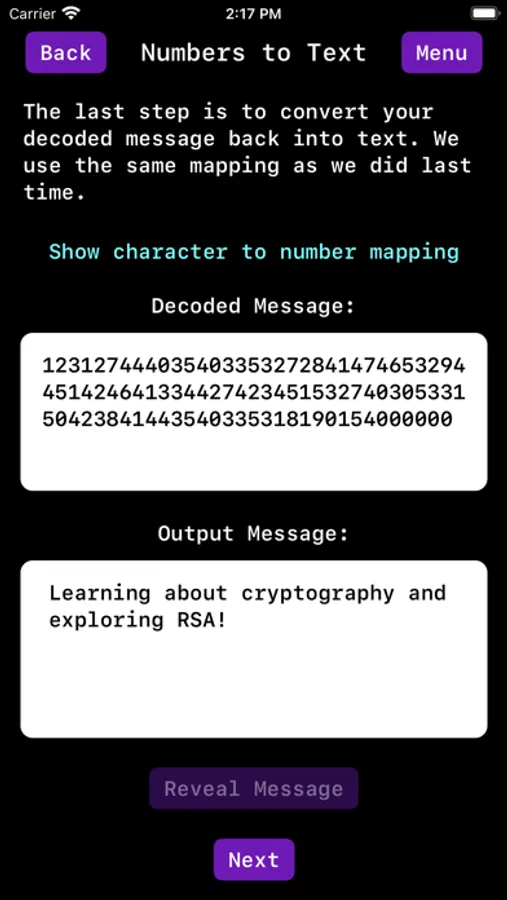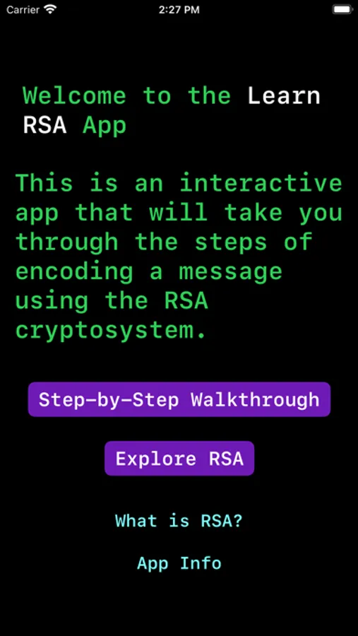 Learn and explore the basics of RSA cryptography, one of the most widely used cybersecurity algorithms in the world. This app features an interactive step-by-step walkthrough where you will learn how to encode and decode your own message, with detailed explanations on the math behind the algorithm at every step of the way.