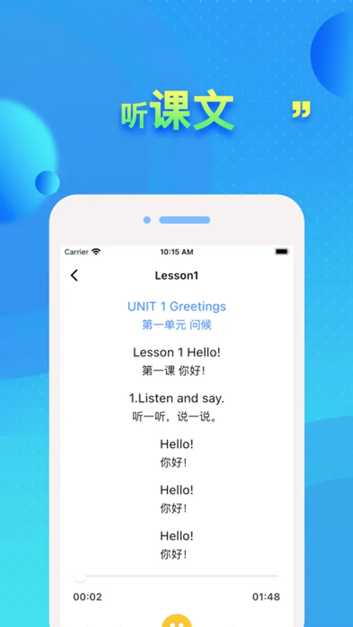 同步课本各单元听力,音频。与单纯音频播放不同,增加语速调整,中英文对照,播放进度控制声音播放与文本同步。