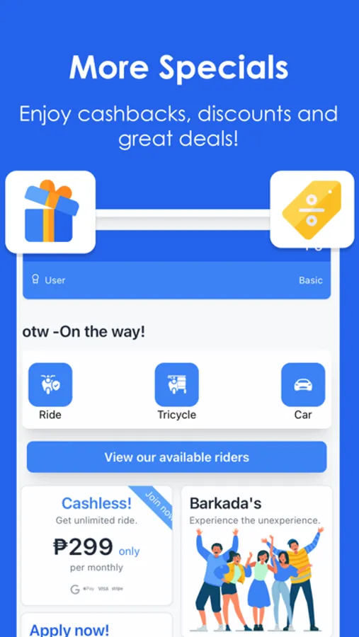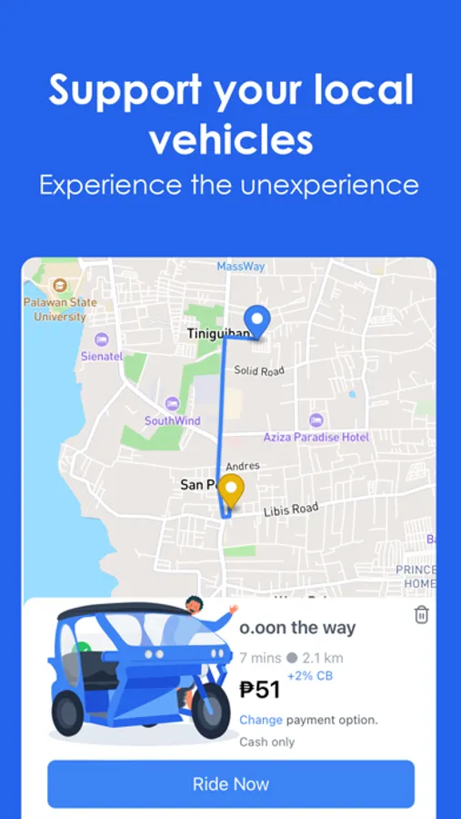 Experience the unexperienced of ride-sharing here in Puerto Princesa city, the first ever ride-hailing app since 2015 is now back with it's powerful and amazing services. Enjoy book for you favorites local vehicles such as tricycle, motorcycle and cars. Play with deals of rewards from referrals and sign ups.